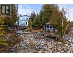 Wake up to the sound of waves & step from your lakeside deck into the crystal clear waters of Dorcas Bay, on Lake Huron. This is 4-season living at its most effortless. Set along one of the most cherished stretches of shoreline on the Bruce Peninsula, this 4 bedroom, 2 bathroom home offers a waterfront experience that feels peaceful & connected to nature. Mornings begin quietly at the water’s edge. Days unfold with swimming, paddling & time spent outdoors. Evenings settle into soft light & unforgettable sunsets across the bay. Inside, the home is bright, open & welcoming. The kitchen, dining & living spaces all orient toward the water, allowing the view to become part of daily life. The main floor offers 2 comfortable bedrooms & full bathroom, creating an easy & functional layout for generational living. Upstairs is where the home really opens up. The generously sized primary suite has wall-to-wall windows, offering incredible lake views & private balcony. There’s plenty of space to create a sitting area, making it feel like its own retreat. A 4th bedroom & large 5pc bathroom with jetted tub & separate shower completes the upper level. Outside, tiered decks lead toward the shoreline, creating spaces to gather & unwind. A 408sf bunkie provides exceptional additional sleeping space (currently sleeps 4, with a sitting area) or a quiet lakeside office, just steps from the water. Thoughtfully updated for year-round comfort, the home includes an updated propane furnace (2025), AC (2020), septic pump (2025) & UV system (2025), along with a spray foamed basement & backup generator for peace of mind in every season. In winter, the landscape becomes quiet, with snow, wildlife, & an ever-changing lake. With year-round road access, it remains easy to enjoy in every season. Just minutes from Tobermory & the Grotto, a place where summers linger, cozy winters feel calm & the rhythm of the lake becomes part of everyday life. A true piece of Canadiana, held right at the water’s edge (id:48169)