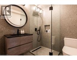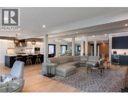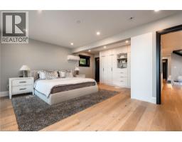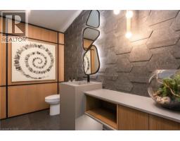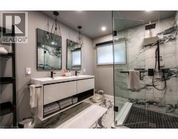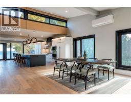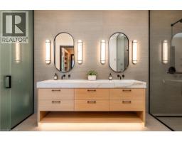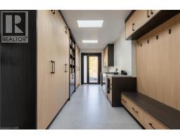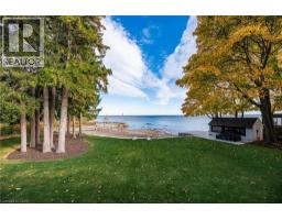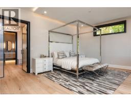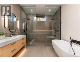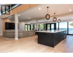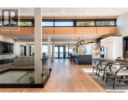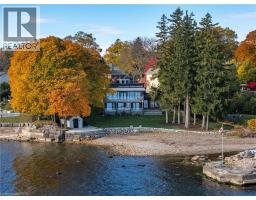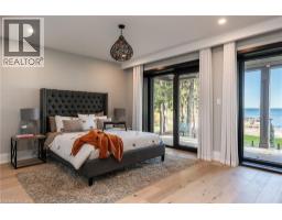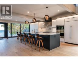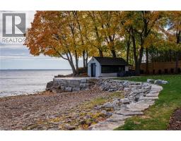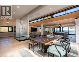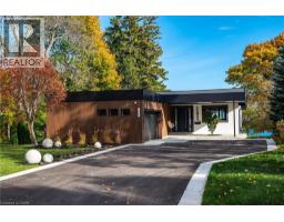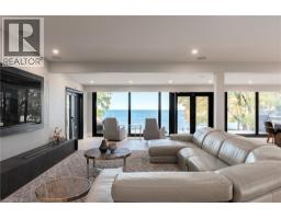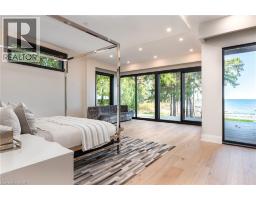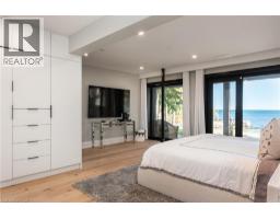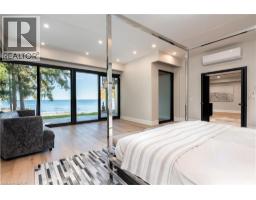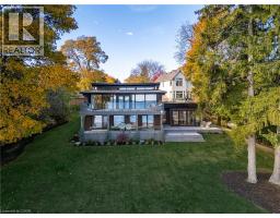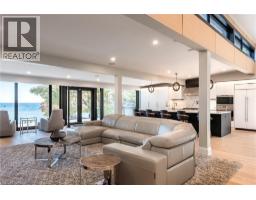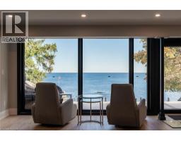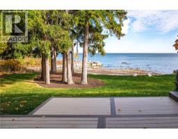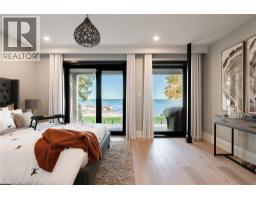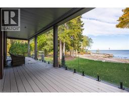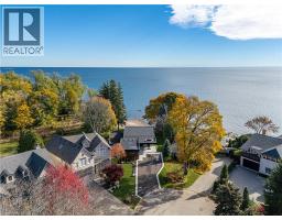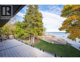Natural serenity meets modern design at 121 Edgecliffe Place. Set on a rare 29,000 sq. ft. pie-shaped lakefront lot where Appleby Creek meets Lake Ontario, this exceptional property offers 105 feet of direct waterfront and 130 feet along the creek with riparian rights, creating an irreplaceable natural setting in the city. This fully renovated home offers over 5,200 sq. ft. of finished living space with floor-to-ceiling windows that draw the lake and landscape into every room. The open-concept main level features 12-foot peaked ceilings, engineered light hardwood, and dark-framed windows that frame panoramic southern views. A chef’s kitchen anchors the space with a large island and top-tier appliances, ideal for entertaining. The walkout lower level accommodates four bedrooms, each with its own ensuite and ductless air conditioning unit. The primary suite opens directly to the lakeside deck, featuring a spa-inspired ensuite with dual rain showers and a massive walk-in closet with custom cabinetry. Radiant in-floor heating extends throughout the home for year-round comfort. Multiple outdoor living spaces blur the line between indoors and out. A covered lower deck and expansive upper terrace with built-in BBQ maximize lakefront enjoyment and capture the home’s stunning setting. Modern. Peaceful. One of a kind on the water. (id:48169)